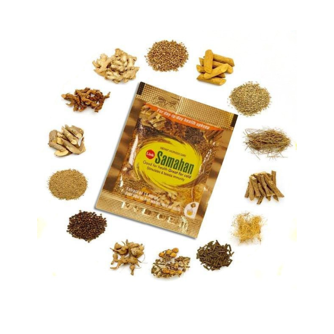 Samahan – tradicinis ajurvedinis žolelių gėrimas iš Šri Lankos, gaminamas iš 14 natūralių augalų, turinčių priešuždegiminių, raminamųjų ir imunitetą stiprinančių savybių. Tai švelnus, bet veiksmingas mišinys, kuris padeda organizmui kovoti su peršalimu, kosuliu, sloga, gerklės skausmu ir nuovargiu.
